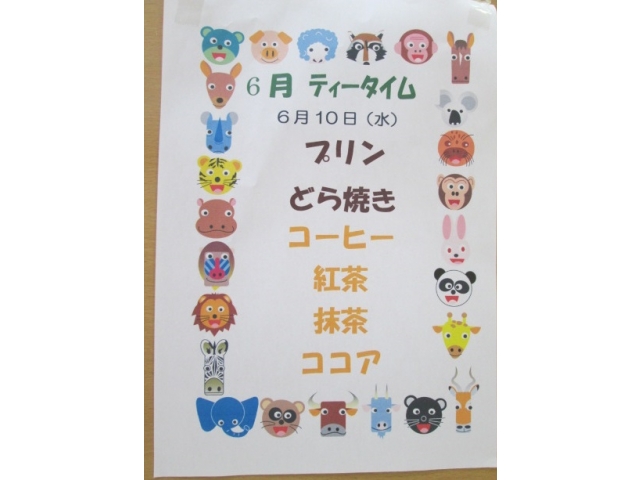6月10日水曜日の午後、お好きな飲み物と美味しいおやつを楽しむティータイムを行いました。東海地方は梅雨入りとなり、あいにくの空模様でしたが、食堂でゆったりとした曲を聴きながら、飲み物とお菓子を楽しまれました。