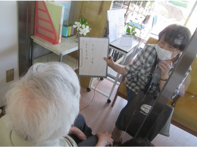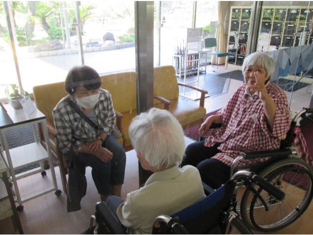 6月22日(月)より、事前に電話予約をいただいている面会希望の方と、正面玄関でガラス越しではありますが、面会が再開されました。久しぶりにお会いでき、面会者の方も利用者様からも笑顔がこぼれました。