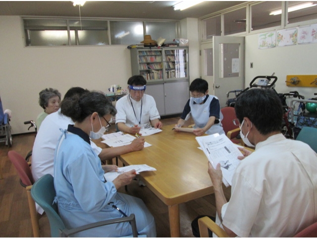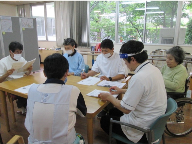 6月25日10時30分から、当苑に歯科診察にいらっしゃる歯科医の先生より、口腔内指導を受けました。毎月開催していて、今月のテーマは「自分で磨けるがうまくできない人への指導方法」と「自分で歯磨きできない人に、効果的に歯磨き介助する方法」について学びました。