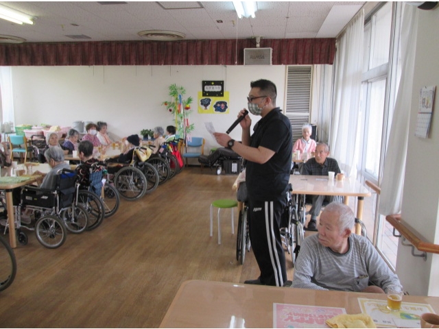 7月8日水曜日に、7月生まれの方の誕生会を行いました。苑長から祝辞をいただき、相談員より今月お誕生者10名の紹介があり、拍手と乾杯でお祝いしました。