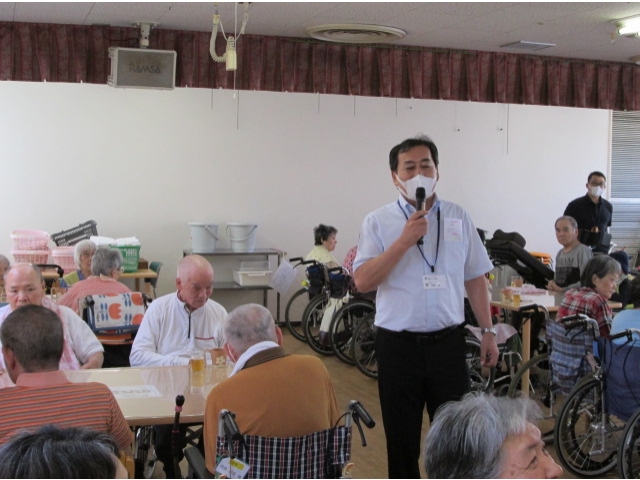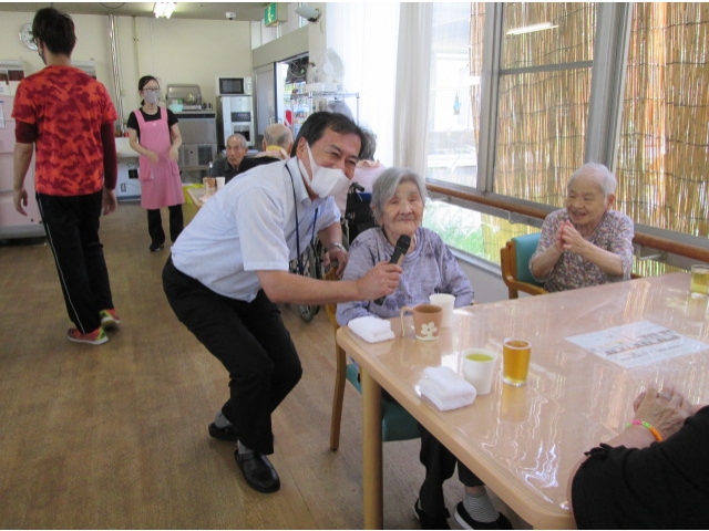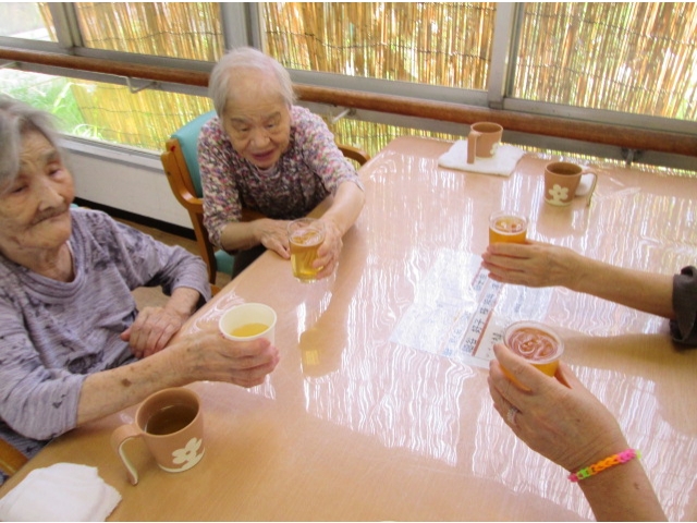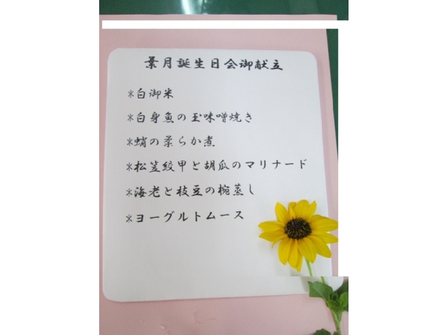 8月12日水曜日の昼食時、8月生まれの方をお祝いする誕生会がありました。女性最高齢の方を含め9名のお誕生日の方を拍手と乾杯でお祝いしました。