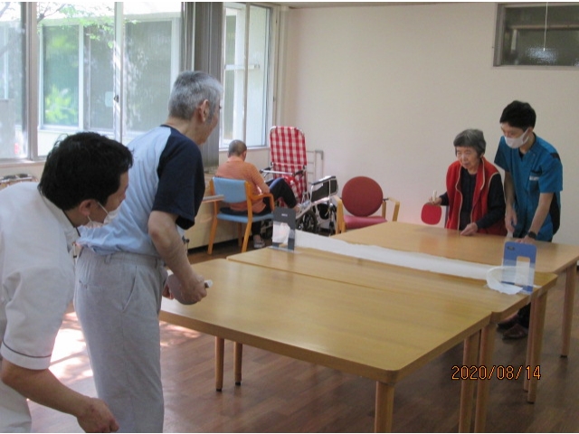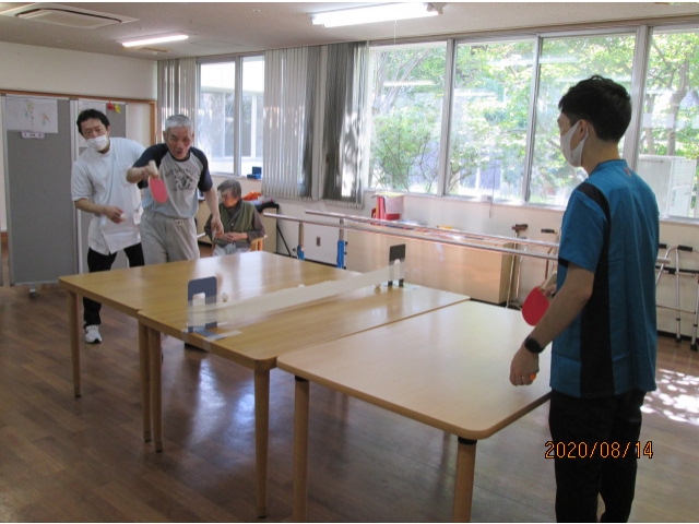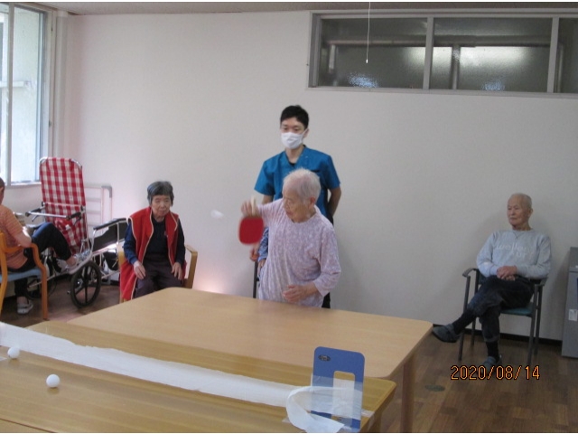 8月14日の昼下がり、毎週金曜日の14時30分頃は体操や、天候が良ければ屋外散歩などを行っています。気温が35?以上あり屋外散歩は中止し、機能訓練室で卓球大会を行いました。卓球が初めてという利用者様もみえましたが、楽しく体を動かし笑顔もたくさん見られました。