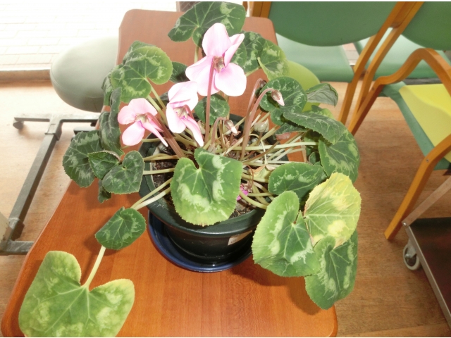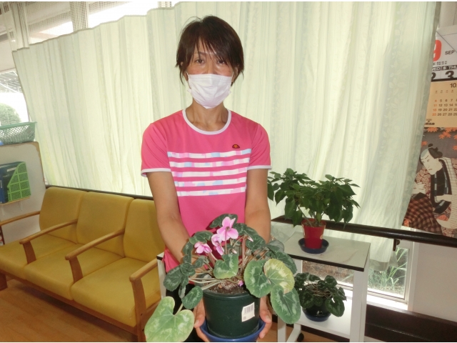 9月に入り、多少暑さも和らぎましたがまだまだ暑い日が続いています。そんな中、本来秋から春にかけて花が咲くシクラメンが綺麗な花を咲かせました。心優しい介護職員を中心にみんなでお世話した愛情が通じたのかもしれません。この時期に花を咲かせることはとても珍しいとの事でした。
