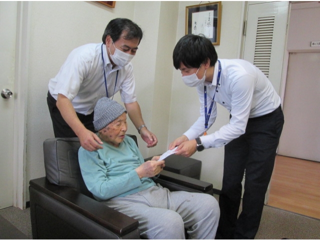 9/8(火)、大府市役所の方が来苑され、数え100歳、数え99歳のご利用者の方への敬老金等が贈呈されました。例年は、会議室に対象のご利用者をお招きして贈呈式を行っていましたが、今年はコロナウイルス対応のため苑長室にて代表の方に受け取っていただきました。ご長寿おめでとうございます!これからもますますお元気で!