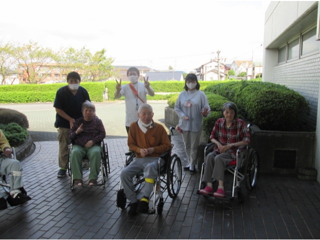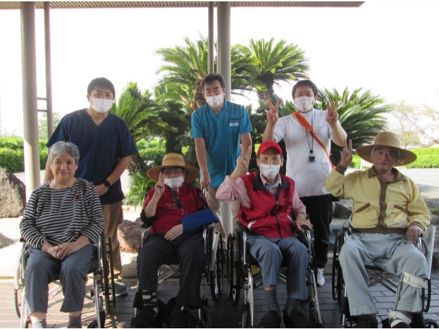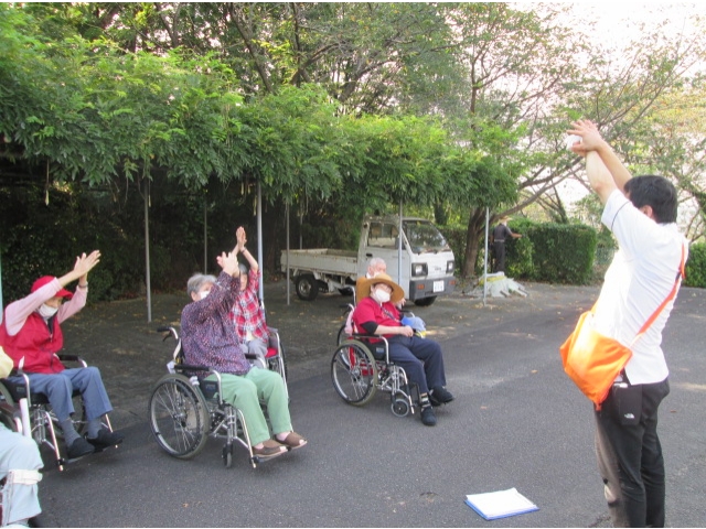 10月2日水曜日の午後、秋晴れで過ごしやすい陽気に誘われ、苑内を散歩し藤棚の下で体操を行いました。お互い適度な距離をとりつつ、秋晴れの青空の下体操を行うととっても気持ちが良かったです。秋を感じながら過ごした午後のひと時でした。