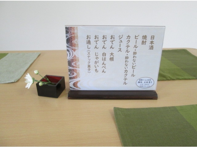 「居酒屋にいきたいなぁ」利用者様のこの一言から『居酒屋プロジェクト』が始まりました。それ以来利用者様のご希望を叶えるため準備をしてまいりました。10月28日水曜日18時30分のオープンに向けてレイアウトや物品が運び込まれると、居室だったお部屋が上品なお店みたいになりました。提灯や旗で廊下からもわかるようにしました。またポスターで周知し、利用者様も朝からオープンを待ちきれない様子でした。