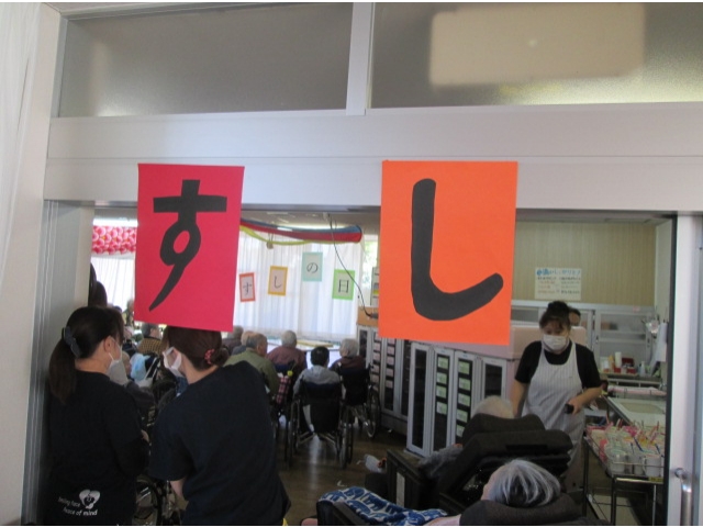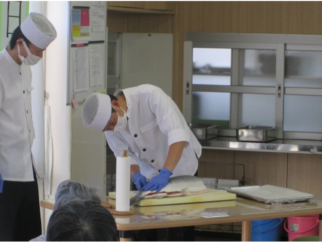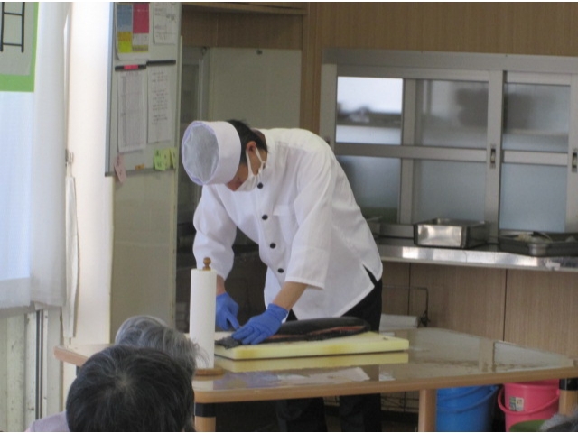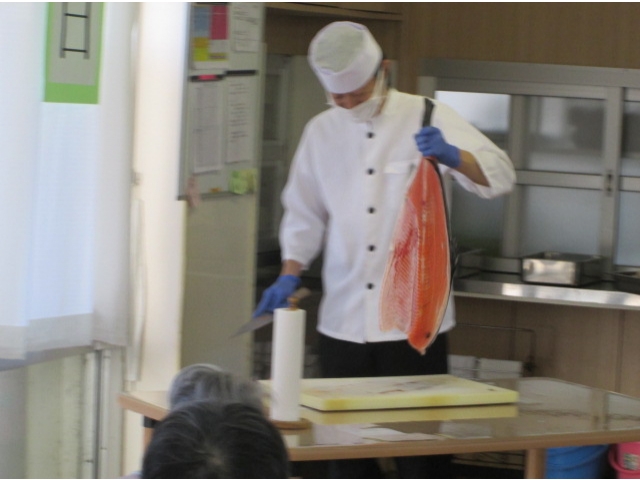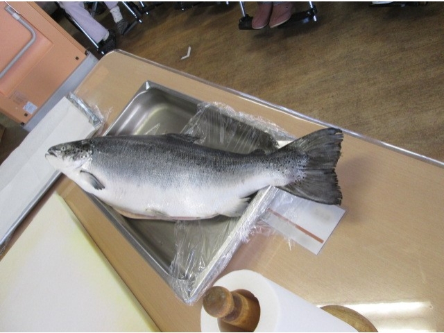 11月11日11時30分ごろから、サーモンの解体ショーがありました。私たちにとっては介護の日(いい日、いい日、毎日、あったか介護ありがとう)でもありますが、今日11月11日は鮭の日でもあります。まな板からはみ出すくらいの大きなサーモンを、調理師さんたちが華麗な包丁さばきで見事に3枚におろし、お刺身をちらし寿司の具として、美味しく頂きました。サーモンが解体される度に大きな拍手につつまれました。