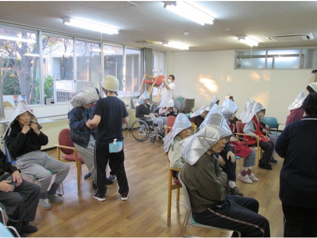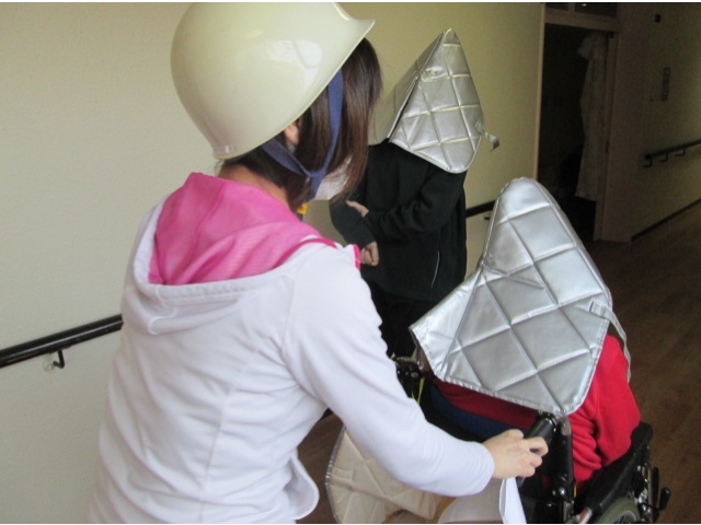 - 防災頭巾をかぶり、職員の指示で避難しています。
