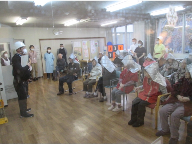 11月16日16時より、夜間に地震が発生するという想定で防災訓練を行いました。16時に緊急地震速報が全館放送され、緊張感の中、職員による非常放送で、状況を説明し、火災が発生した想定で初期消火を行い、消火不能の判断で、避難誘導を開始し消防署からの逆信に対応。避難場所へ集合し避難完了。点呼確認し、次長より総評がありました。誘導場面では声を掛け合いながら、ほぼ予定の時間で避難誘導が行えました。日ごろの訓練を有事の際も活かしていきたいです。