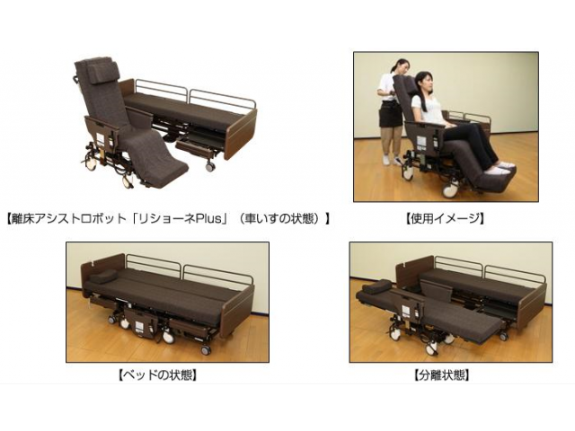 リショーネとは、ベッドが半分に分離し車いすとして使用できる介護ロボットです。利用者様の離床機会を増やし、介護者の介護負担軽減にもつながります。実際にコロナ禍でガラス越しの面会にもリショーネを使用し面会機会が増えたことなど具体的な事例を踏まえながら効果の実証を行いました。