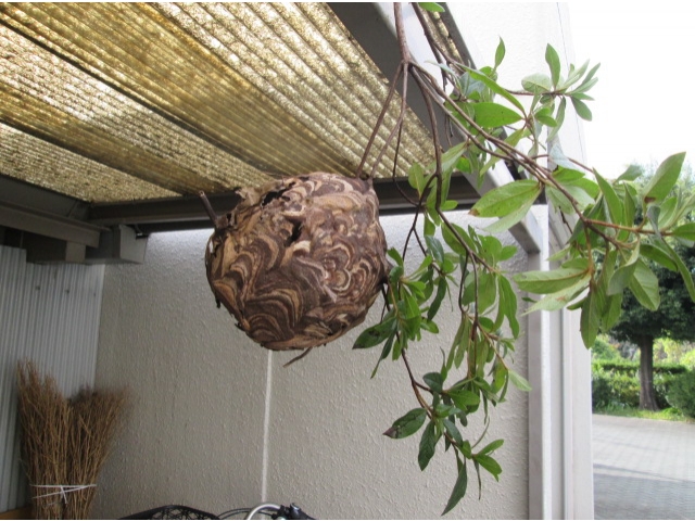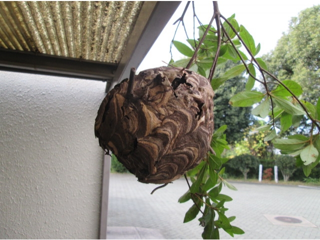 日に日に寒さが厳しくなる12月2日のお昼ごろ、環境整備をしてくださっていたシルバー人材センターの方から、スズメバチの巣を見つけて駆除してくださったとのこと。蜂も5匹ほどいたそうです。職員が駐車する場所のすぐ近くの植え込みでした。この時期と巣のあった場所と大きさにビックリしました。