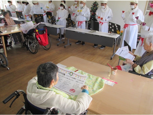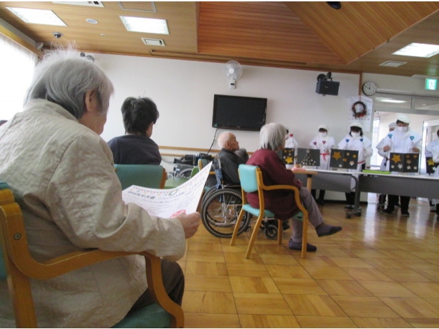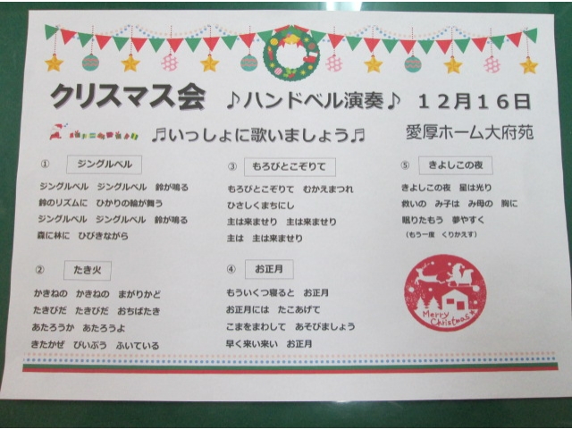 職員によるハンドベルの演奏に合わせて、皆さんでクリスマスソングやお正月を歌いました。