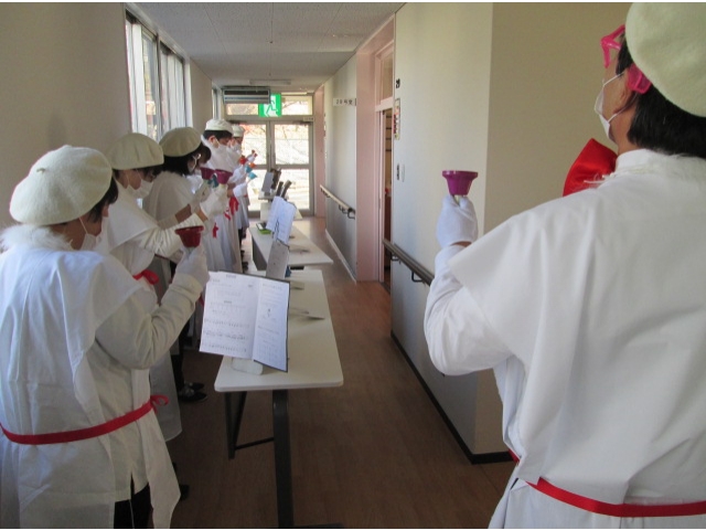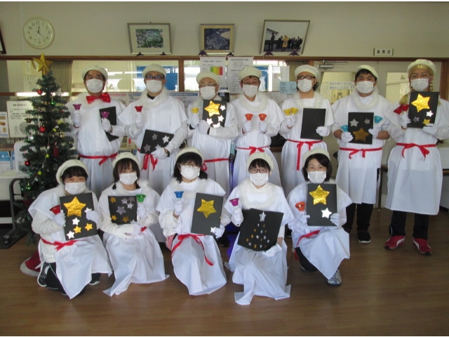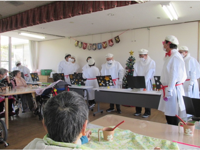12月16日水曜日、昼食前にクリスマス会を行いました。当日はクリスマスらしい雪が降りそうな寒い日でした。