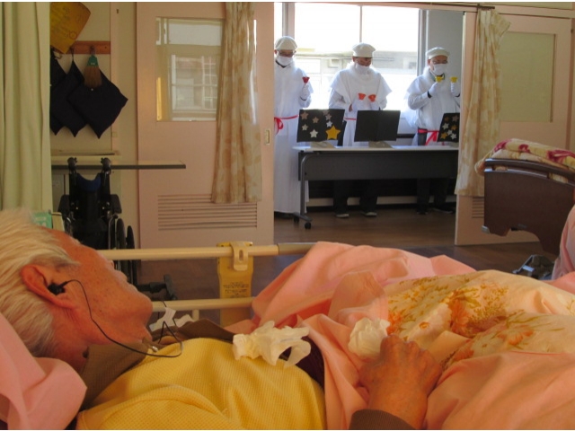 - 居室で食べられる利用者様にも、廊下から演奏をお届けしました。