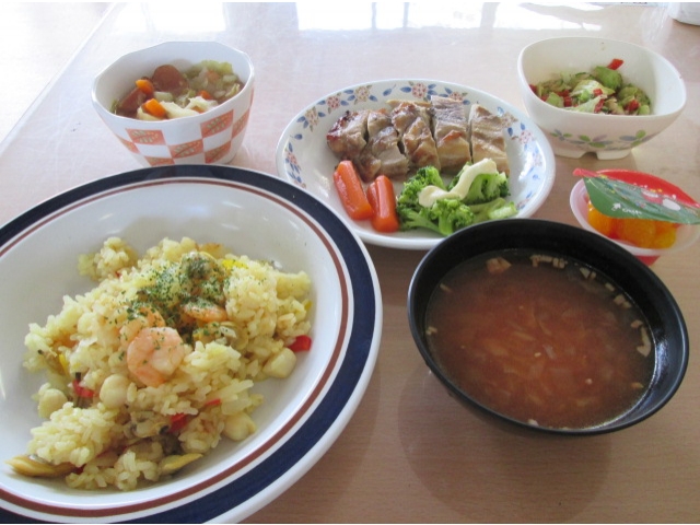 - 今日の昼食は、パエリヤやチキンなどクリスマスらしいメニューでした。