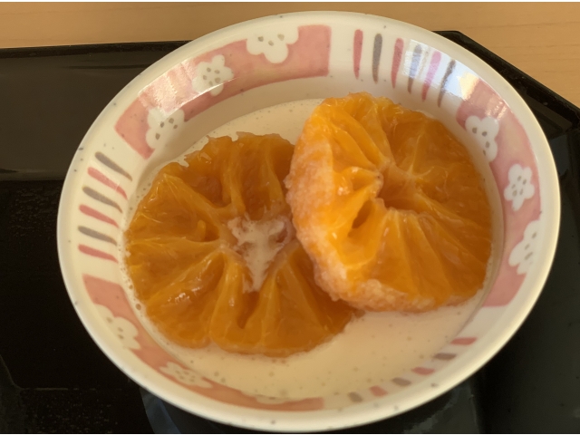 - みかんのコンポートです。甘くて柔らかくて美味でした。