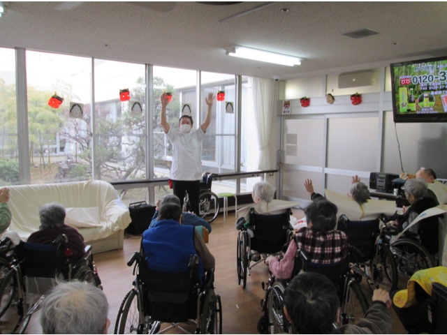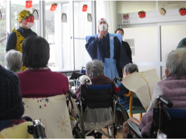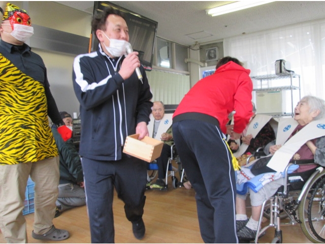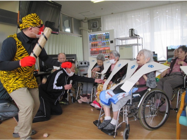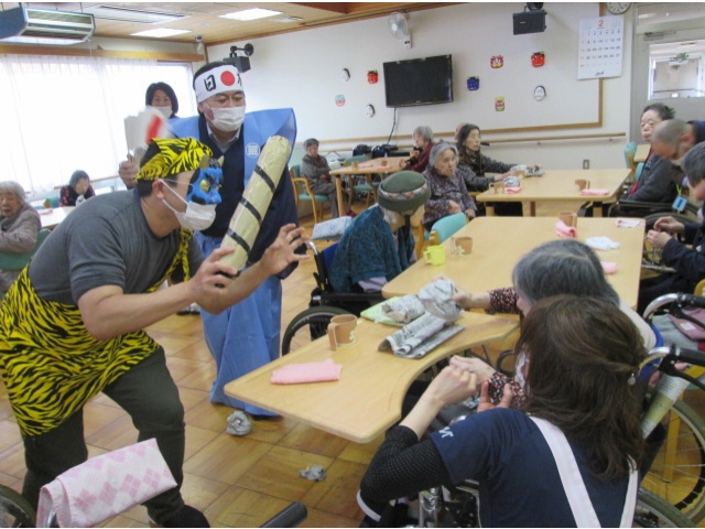 - 年男・年女の利用者様を中心に、豆をまいて、鬼を退治しました。
