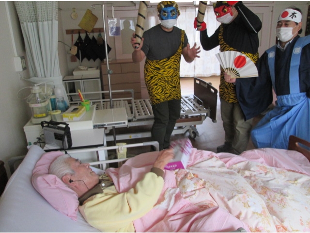 - お部屋で食事をされる利用者様も、豆まきで邪鬼を払いました。