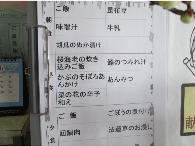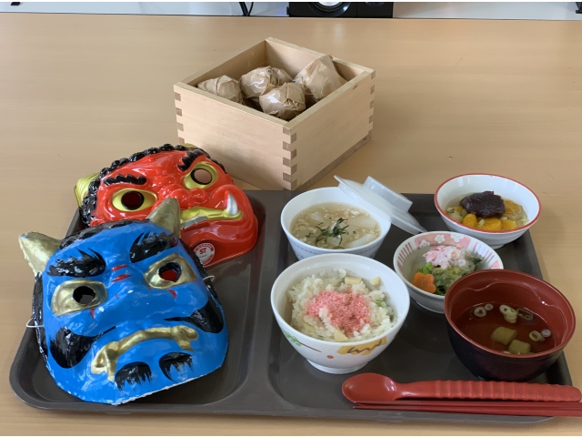 昼食も行事食で、春を感じるメニューになっていました。2月3日は立春です。午前中雪交じりの雨も降っていましたが、施設内の梅も花を咲かせているなど、春はゆっくり近づいてきているようです。