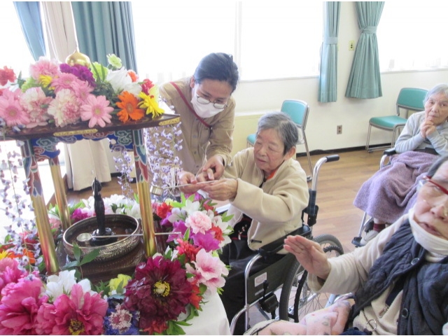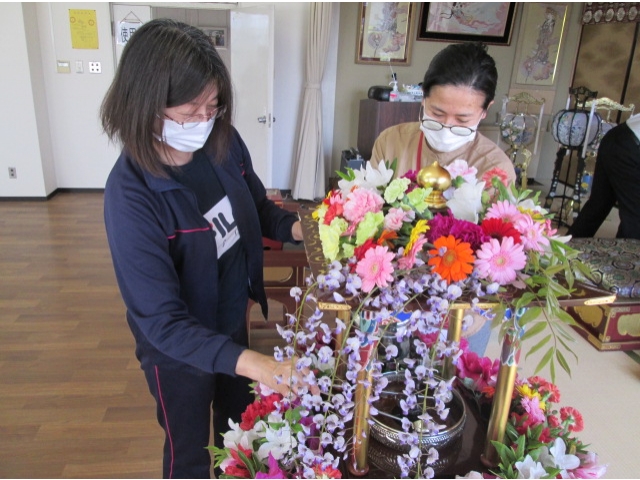 大府苑では、4月8日を少し過ぎてしまいましたが、月例祭と同じ日の4月20日に行いました。朝から担当職員を中心に、お釈迦様の周りをたくさんのお花で飾り付けしました。花屋さんから購入した花と、職員が持ち寄った花、苑内で咲いていた花を組み合わせて、華やかな飾り付けができました。