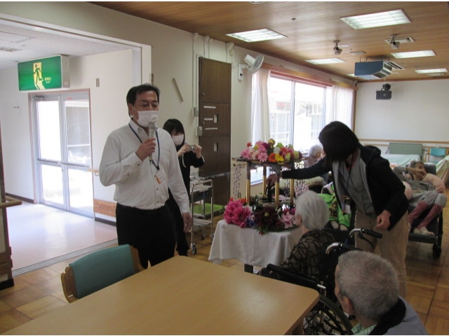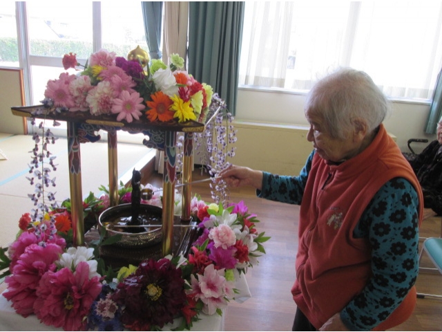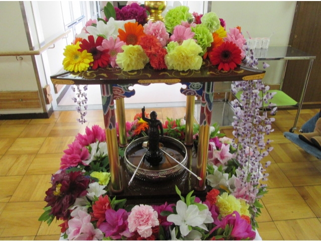 利用者様が一人一人、甘茶をお釈迦様にかけて、花祭りのお祝いをしました。