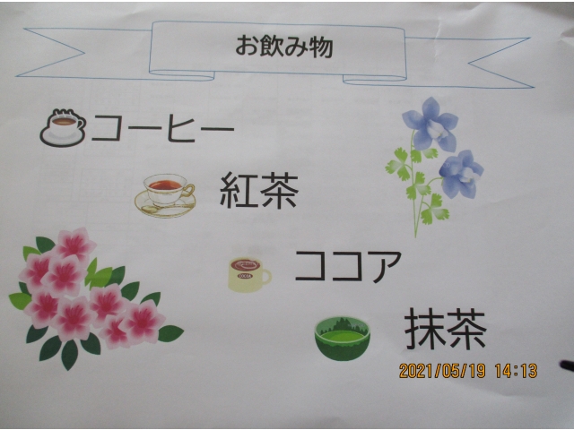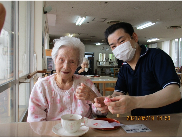 5月19日水曜日の14時30分より、ティータイムを行いました。今日のお菓子は柚子餡のねりきりとお好きな飲み物を提供しました。