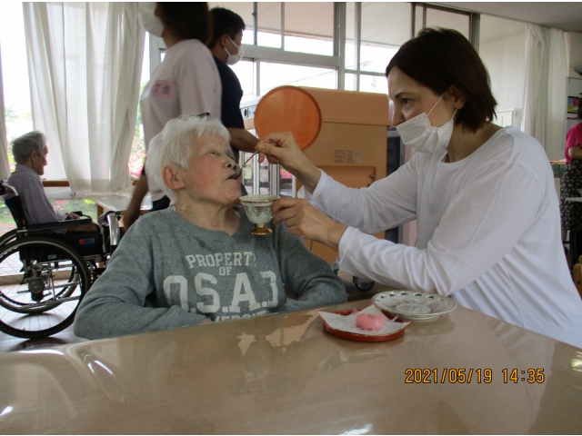 - 職員と一緒に、ゆったりとティータイムを楽しみました。