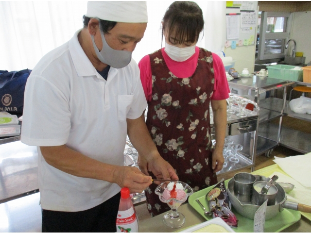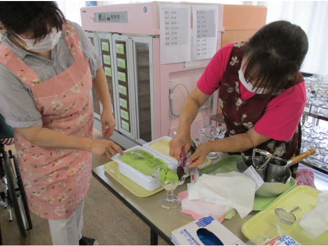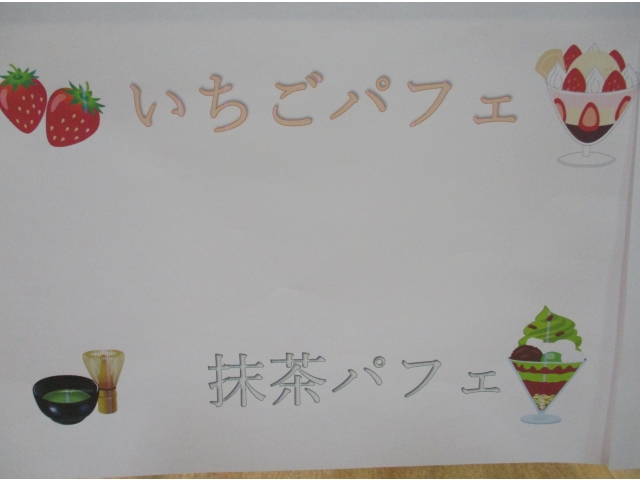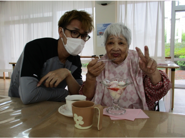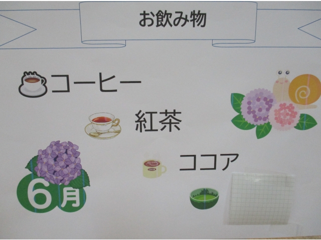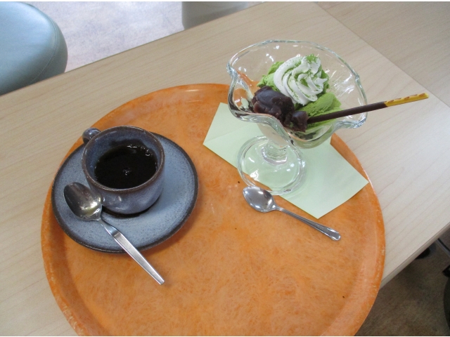 6月16日水曜日14時30分からティータイムを行いました。今日は、抹茶かイチゴのパフェとお好きな飲み物を選んでいただき、素敵なBGMの流れる食堂で、梅雨の昼下がりにパフェを食べながらゆったりした時間を楽しみました。