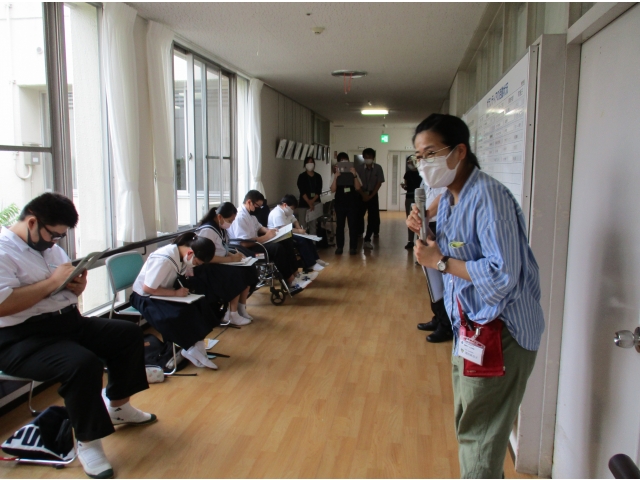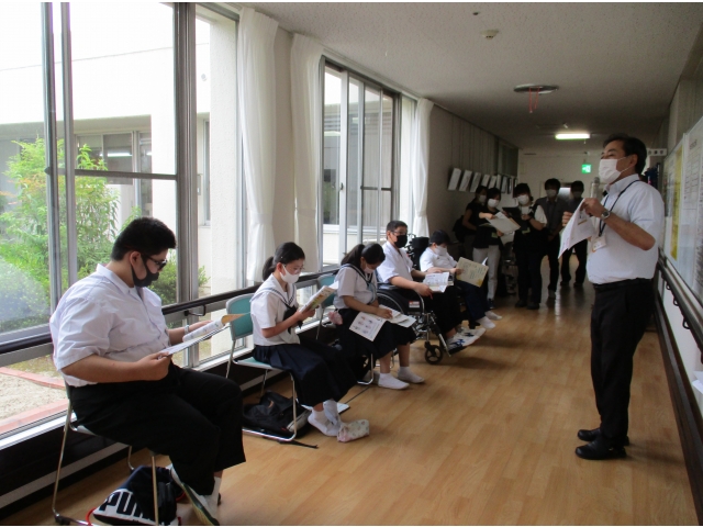 手指消毒の後、ソーシャルディスタンスを保ちながら、相談員の司会進行で、生徒さんから挨拶の後,苑長より事業概要説明がありました。その後の質疑応答では、「何故この仕事に就いたのですか?」など全員から質問があり、各職員が回答させて頂きました。