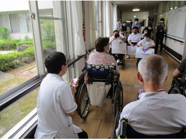 レクリエーションでは、距離をとりつつ、交流できる項目として、クイズと風船バレーを行いました。生徒さんからのクイズでは生徒さんたちが考えた問題を、時にはヒントをもらいながら全問正解できました。大府苑の利用者からも5問出題しましたが、お互い全問正解でした。
