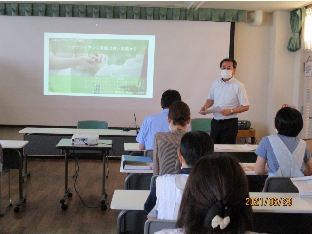6月23日15時30分から、「褥瘡予防について」「コンプライアンスについて」の職員研修を行いました。