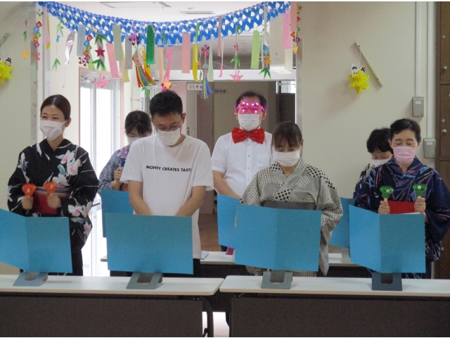 行事担当の司会進行で、苑長の挨拶、ハンドベルの演奏、その合間に、相談員より利用者様の短冊の願い事の紹介がありました。ハンドベルは夕方に集まって練習し、女性職員は浴衣に着替え七夕祭に花を添えました。