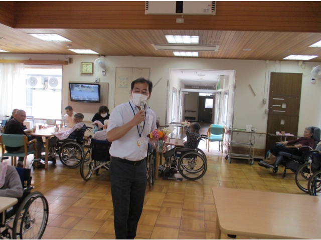 相談員の司会進行で、苑長より苑内に咲いていた花を手に祝辞がありました。