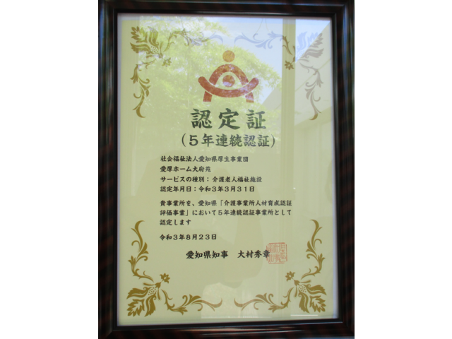 先日愛知県から、「介護事業所人材育成認証評価事業」において5年連続認証事業所として、認定していただきました。 今後も認証されるように、精進してまいります。