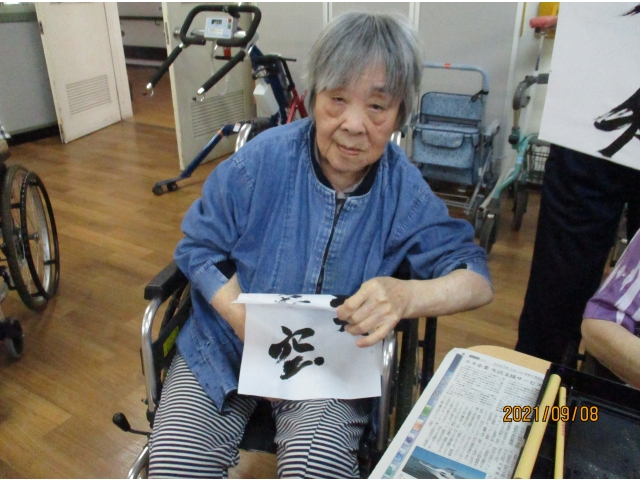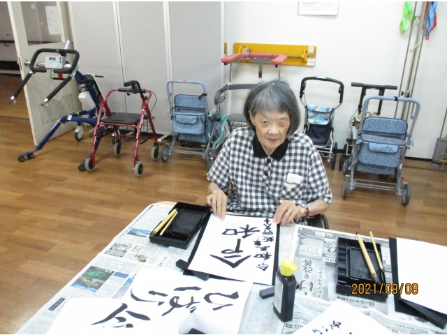 利用者様の個性が表れ「令和」や「平和」などの文字や筆で手紙をしたためる方もいました。作品は廊下に掲示しています。