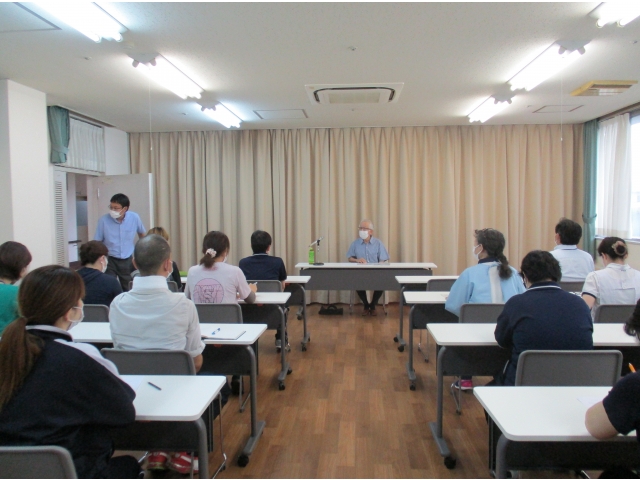 今月の職場研修は産業医である平野内科の平野先生にお越しいただき、新型コロナウイルスワクチン接種の有効性についてお話をいただきました。日本ではワクチン接種について一部批判的なデマが流れたこともありましたが、新型コロナの感染者や死亡率など具体的な数字を用いて正しい情報を判断していくことの大切さをお話してくださいました。