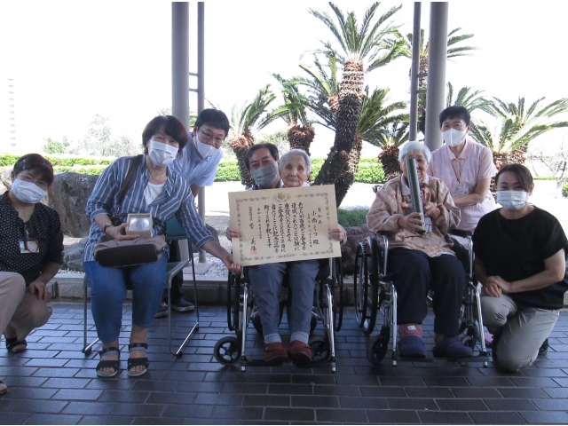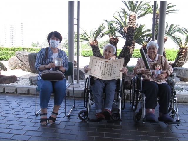 10月5日火曜日にご家族の面会があり、お祝い状と記念品の授与を行いました。最後は、ご家族や職員と一緒に記念撮影を行いました。