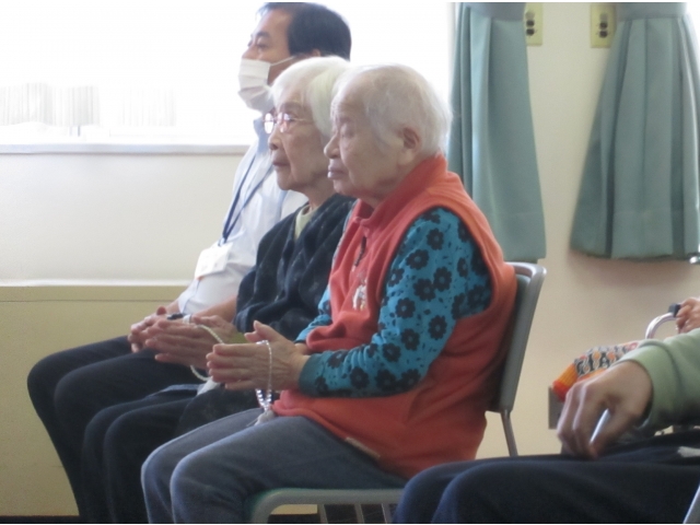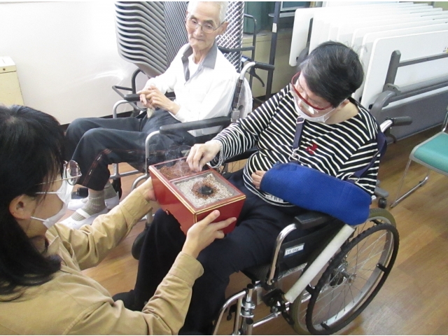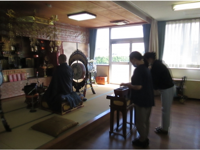 今月は北崎町の曹洞宗光善寺より加納住職にお越しいただきました。住職からは秋にちなんで焼き芋の思い出のお話がありました。偶然にも、大府苑では明日のティータイムでは焼き芋がふるまわれます。利用者の皆さまも楽しみにしてくださっています。