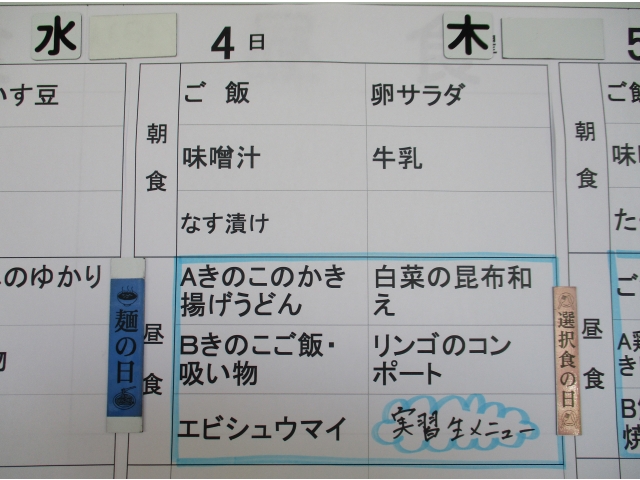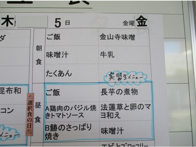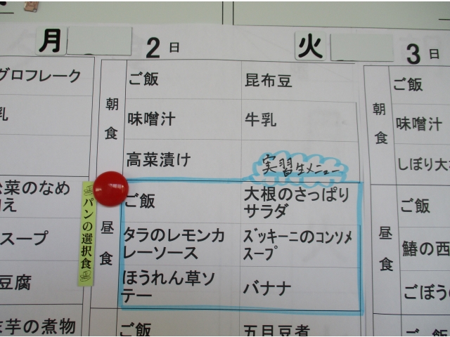 11月に入り、3日間に分けて管理栄養士の実習生さん達が考えたメニューが、昼食の献立として利用者様と職員に提供されました。 どの献立も旬の食材も取り入れながら、食べやすくとっても美味しかったです。実習生の皆様ありがとうございました。
