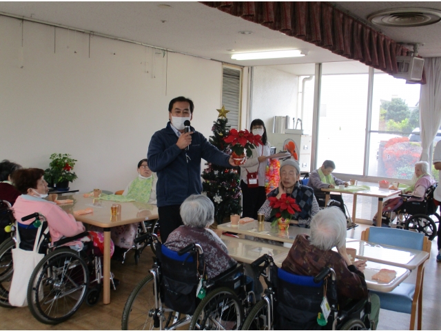 相談員の司会進行の下、苑長より祝辞がありました。クリスマスによく見かけるポインセチアの花を手に持ち、メキシコ原産の植物で、葉は緑色になり、葉の形の苞葉が赤く染まり、小さな花が集まっているなどの説明がありました。