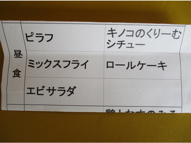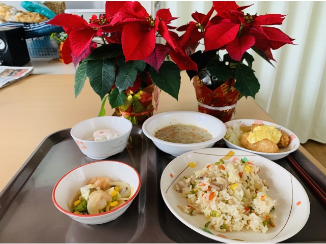今日は、ミックスフライを中心に洋食のメニューでした。ロールケーキもあり、少し早めのクリスマス気分を味わいました。