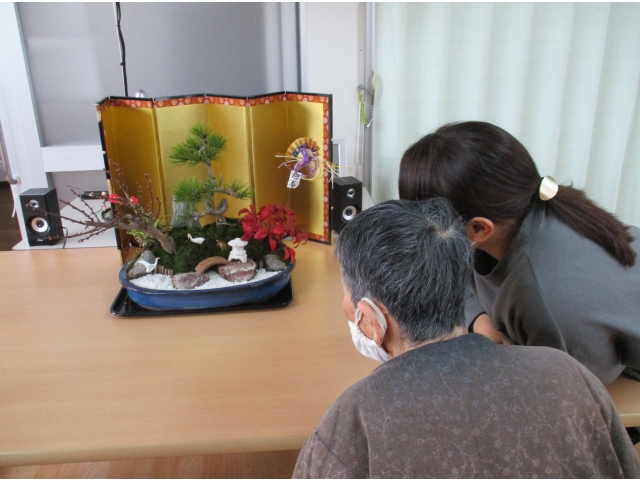 早速食堂前に飾り、後ろには金屏風を置き、厳かにかつ煌びやかに新年が迎えられるように、利用者様と職員で鑑賞していました。
