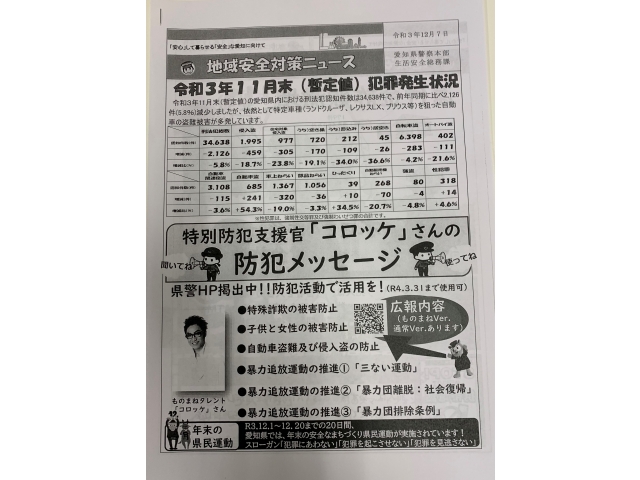 令和3年12月20日(月)、職場研修がありました。内容は防犯についてで、愛知県警がYouTubeにあげている動画をもとに学びました。 これから年末年始を迎えるにあたり、業務中はもちろんのこと、プライベートにおいても気持ちを引き締めていきたいものです。