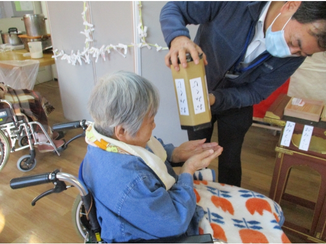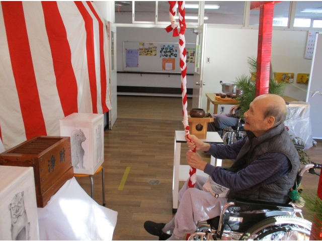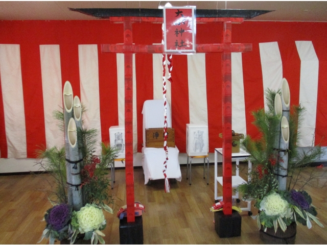 1月5日13時30分頃から、職員による手作りの鳥居と狛犬、大府神社の看板と壁を紅白に飾り付け、左右には門松を並べ苑内に初詣できる場所を作りました。