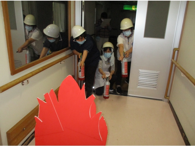 その後、消火器や消火栓を用いて初期消火訓練を行うとともに、非常放送設備により利用者様に火災を知らせ、宿直代務員役の職員は通報連絡訓練を行いました。