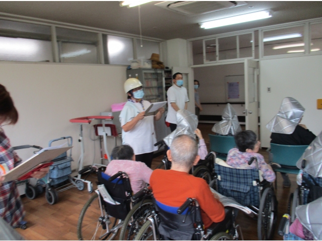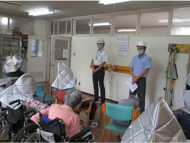 さらに利用者様の避難誘導を行い、点呼確認後に隊長(苑長)に報告し、苑長の総評をもって訓練は終了となりました。