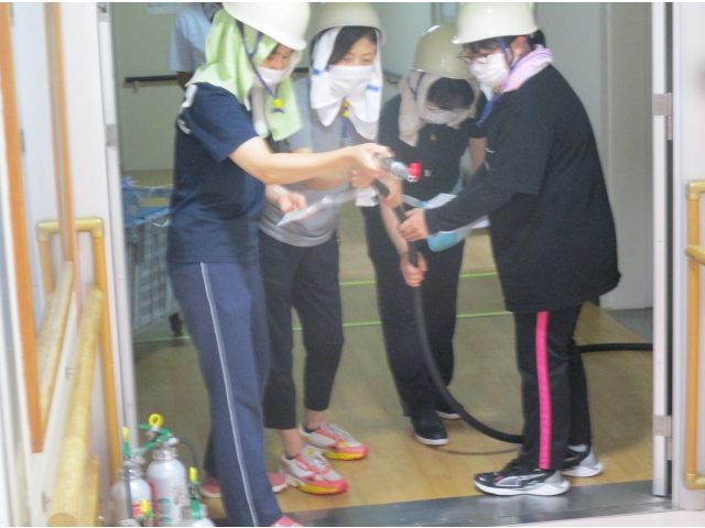 - 屋内消火栓を使用し、消火訓練も行いました。