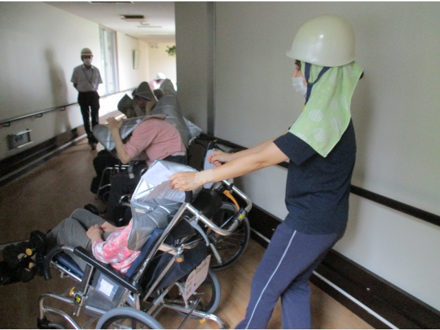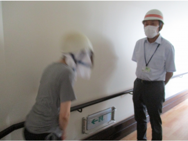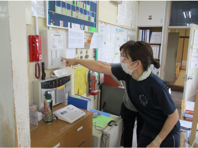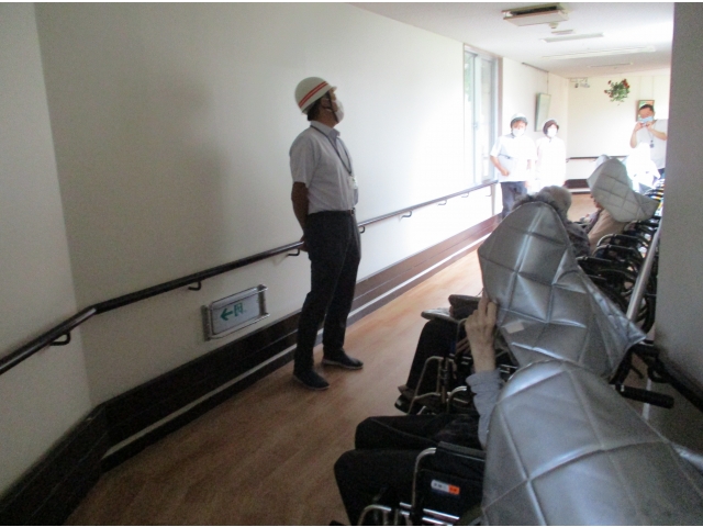 訓練では、初期消火で消火できなかった状況を想定して、非常放送設備で利用者様へ火災を知らせ、避難場所まで避難しました。