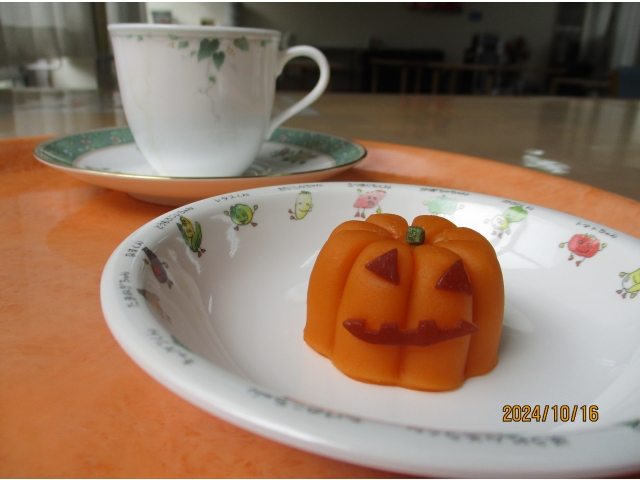 10月16日(水)14時から、10月のティータイムを行いました。 ハロウィンが近いこともあり、南瓜の練りきりと飲み物を楽しまれました。 まだまだこの時期にしては、暑い日が続いていますが、朝晩は秋らしくなってきました。少し早いハロウィンを楽しみながらゆったりとティータイムを楽しまれました。