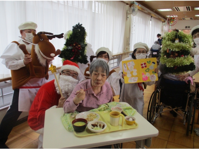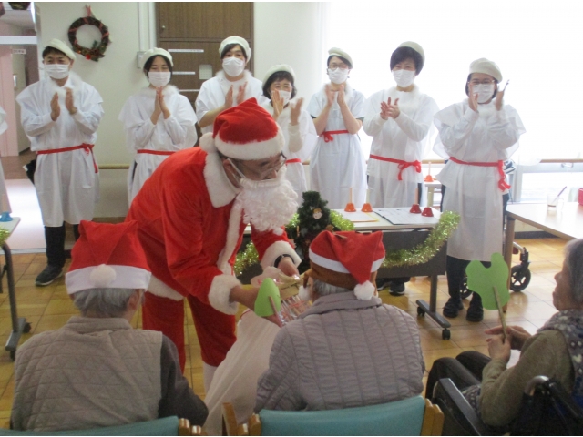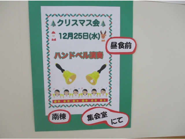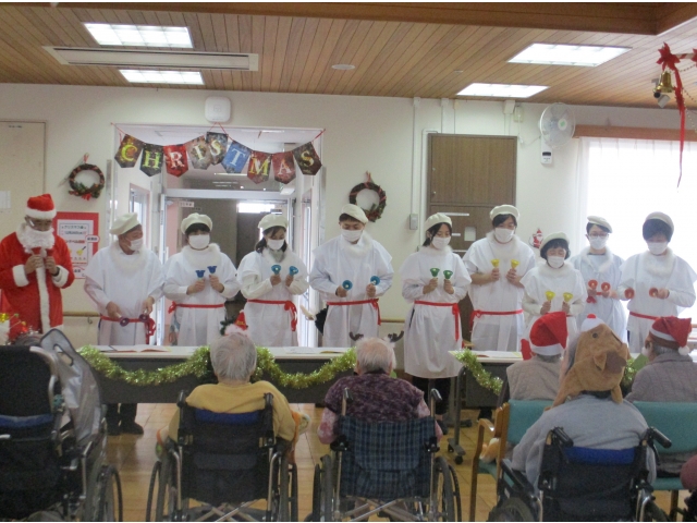 昼食はピラフやフライドチキン、コーンスープやチョコムースなどクリスマスにぴったりなメニューでした。昼食前にサンタさんとハンドベル隊が、プレゼントを代表のご利用者様に贈呈しました、ハンドベル隊による“きよしこの夜”と“ジングルベル”の演奏の後、サンタさんの掛け声で、全員でメリークリスマスと唱えました。